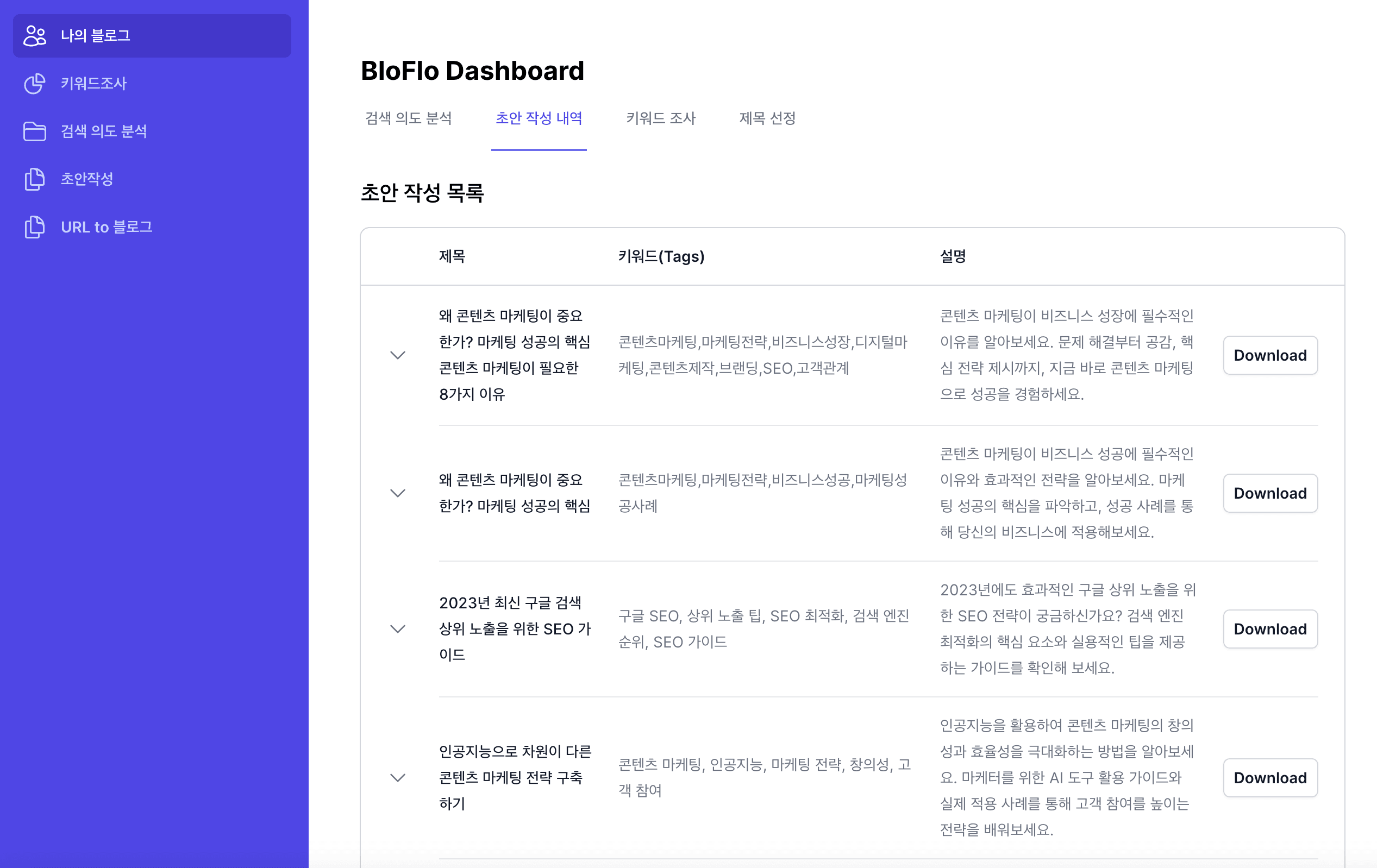 블로플로(BloFlo)를 통해 작성된 AI 블로그 글을 효율적으로 관리하고 효과적으로 블로그 글쓰기에 활용 할수 있습니다.