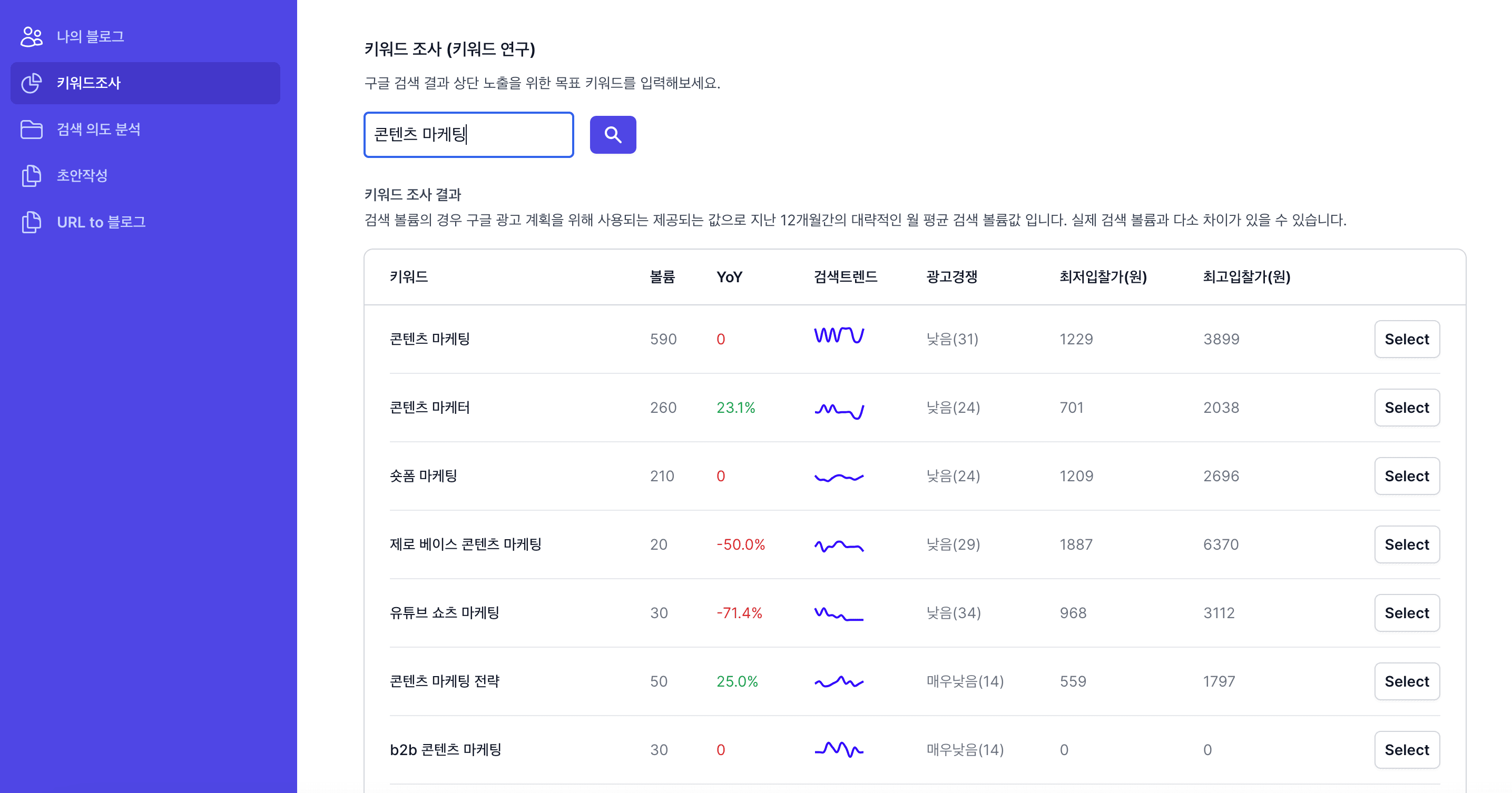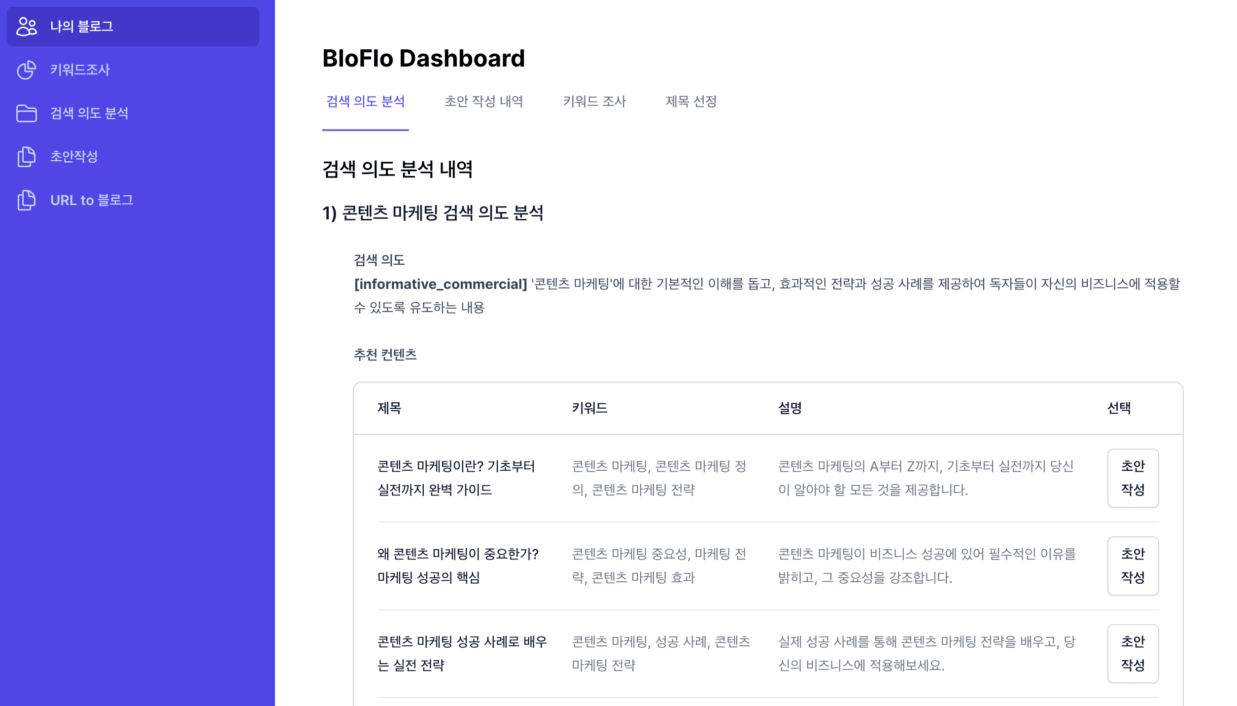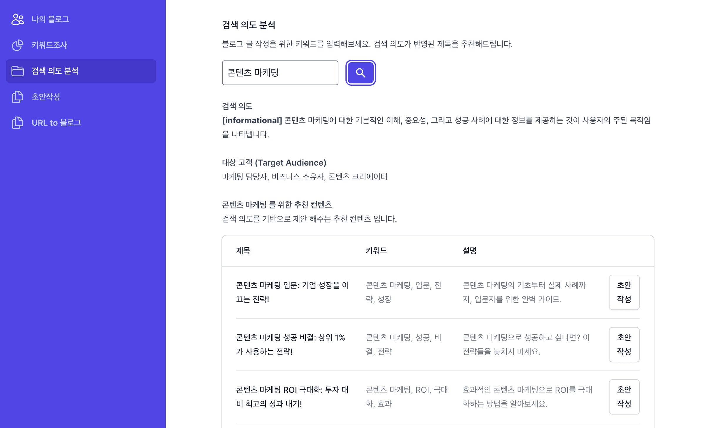 사용자의 검색의도를 파악하여 구글 SEO에 맞는 컨텐츠 내용을 제안 해줍니다.