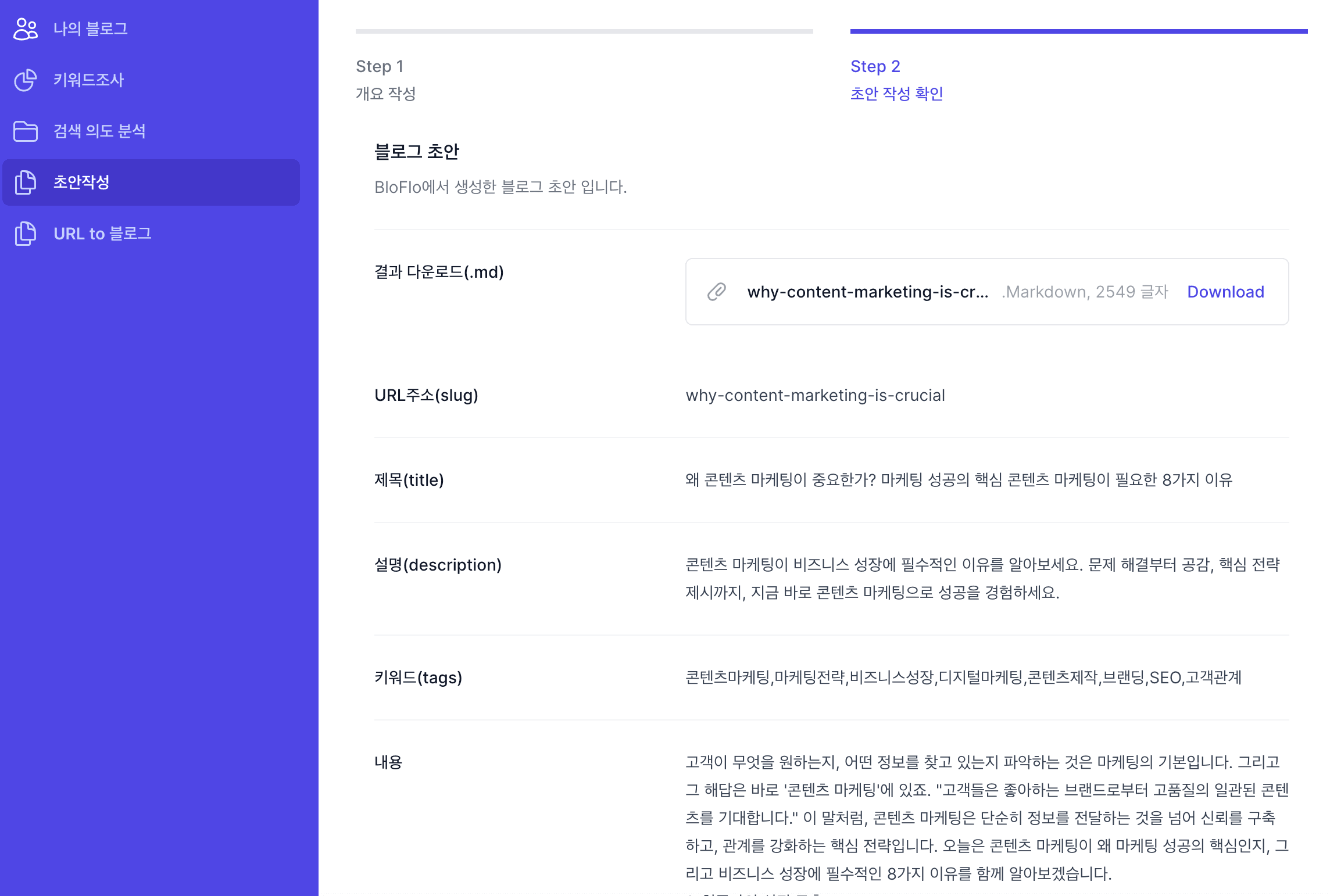이제 키워드만 넣으면 고객이 찾아오는 블로그가 완성됩니다. SEO 최적화 된 콘텐츠 작성, BloFlo로 5분만에 시작해보세요.